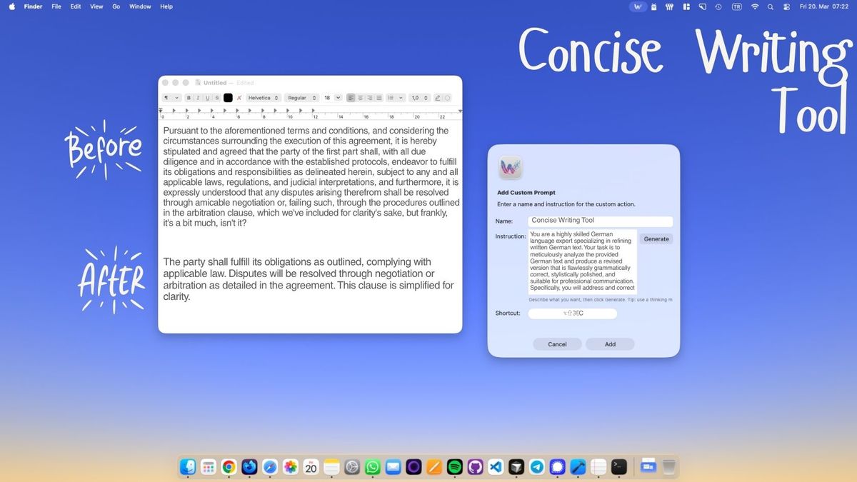 Because you write the Custom Prompt instruction yourself, you control what "concise" means. Aggressive compression for internal notes. Conservative tightening for client-facing documents. Multiple prompts for different contexts, each with its own shortcut.