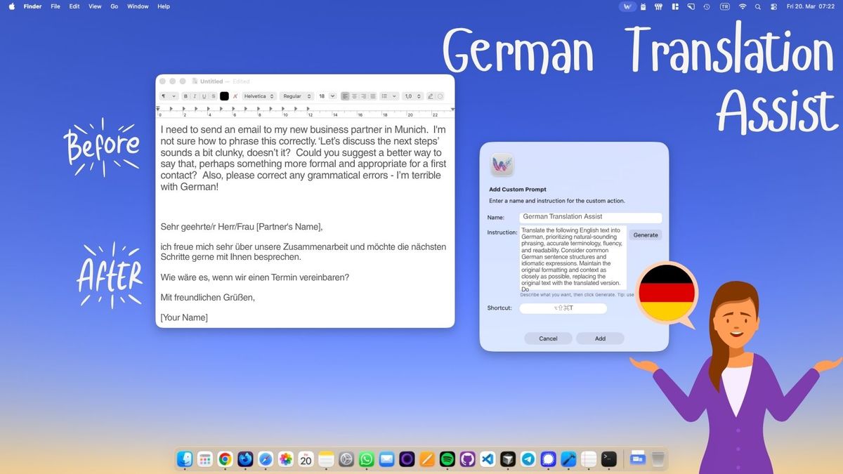 Switching to a browser tab every time you need to translate to German is one of those small interruptions that adds up fast. You lose your train of thought, the pasted result never quite fits, and you spend more time wrangling windows than actually writing. For anyone who communicates regularly in German — business emails, client updates, internal docs — this friction becomes a real bottleneck.