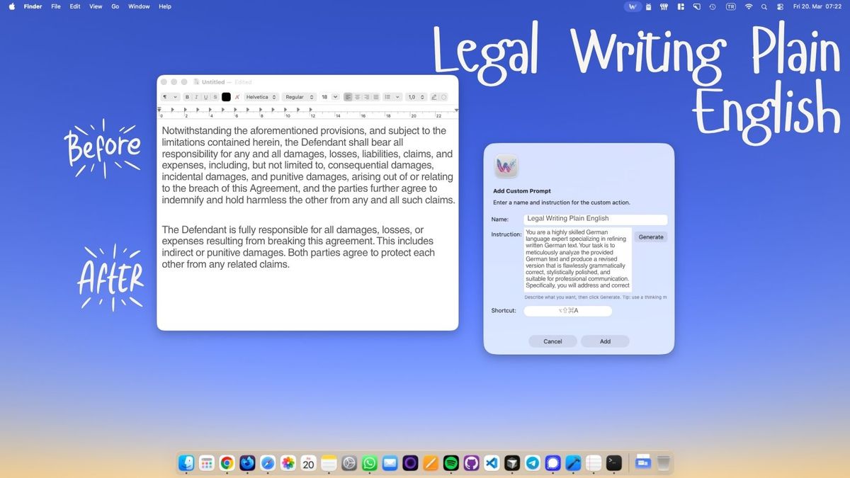 Legal documents are notoriously hard to read. WunderType's custom AI prompts let lawyers, paralegals, and anyone working with legal text convert dense legalese into plain English — right from the menu bar.