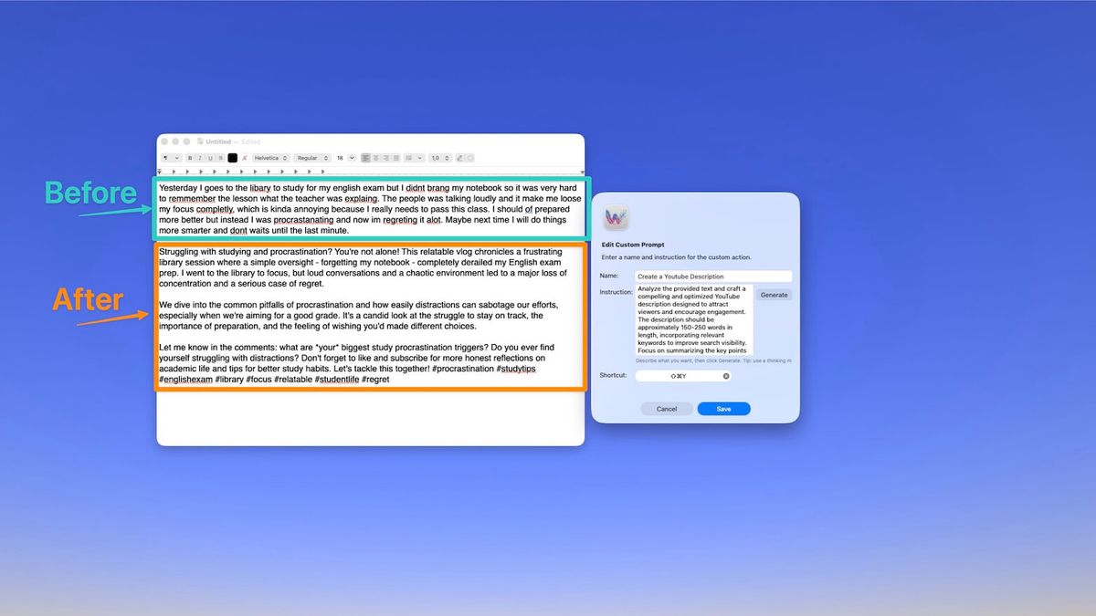 WunderType takes the opposite approach. Five writing modes cover 90% of daily writing needs. Custom prompts handle the rest. The interface is minimal — select text, press a shortcut, done. There's no action library to browse, no workflows to configure, no diff view to review. The corrected text simply replaces your selection.