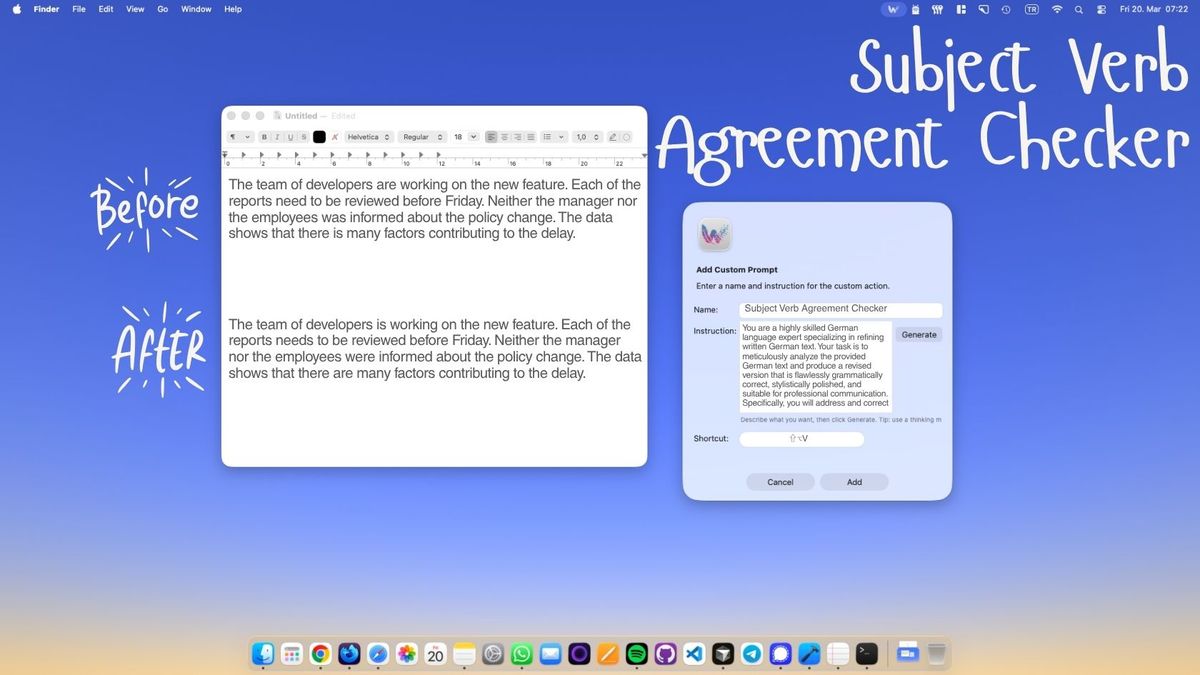 Subject-verb agreement errors are subtle and easy to miss. WunderType's custom prompt finds and fixes them instantly in any macOS app -- no browser needed.