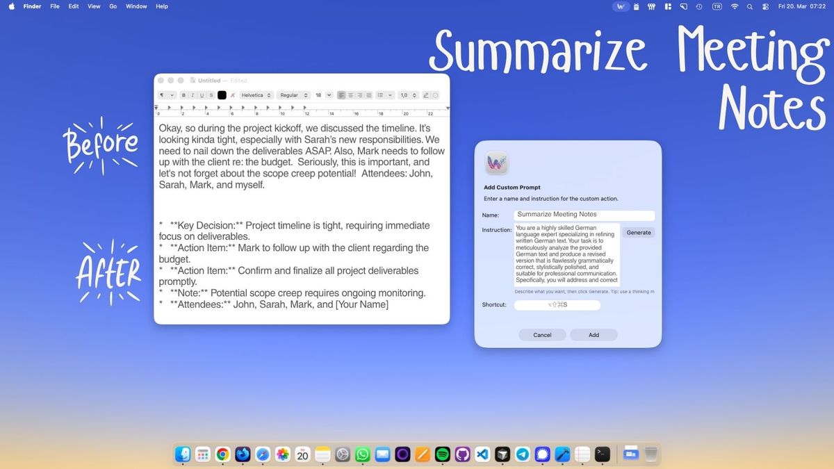 WunderType is a macOS menu bar app that gives you AI-powered text actions through Custom Prompts. Each prompt carries its own instruction and keyboard shortcut, and it works in every app on your Mac — Notes, Google Docs in your browser, Notion, Obsidian, or wherever you take meeting notes.