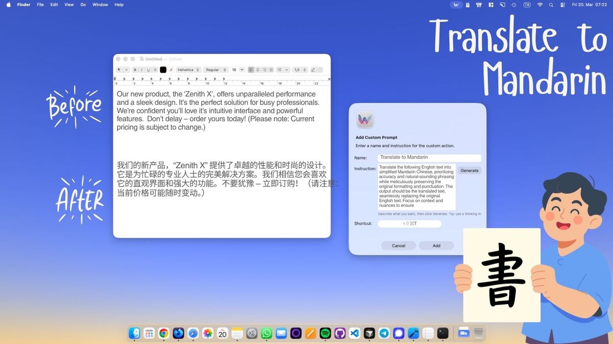 WunderType is a macOS menu bar app that lets you create Custom Prompts — AI-powered text actions triggered by keyboard shortcuts. Build a "Translate to Mandarin" prompt that converts selected English text into natural Simplified Chinese, paying attention to context and nuance. Select your text in any app, press the shortcut, and the Chinese translation replaces the original.