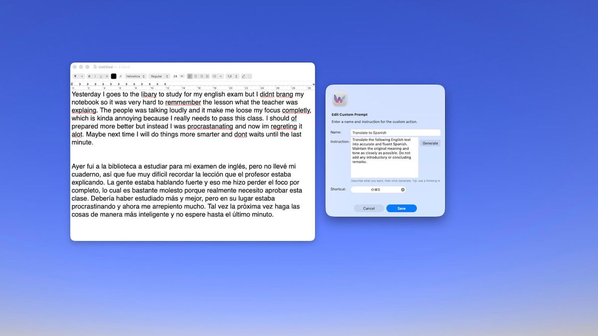 With custom prompts, WunderType goes even further. Translate a paragraph into German. Summarize meeting notes into action items. Rewrite a technical explanation for a non-technical audience. These are things a rule-based proofreader simply cannot do.