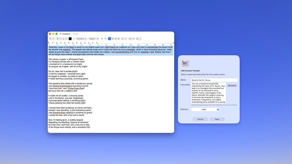 The biggest gap between Apple's Writing Tools and WunderType is flexibility. With WunderType, you can create unlimited custom prompts for any text transformation you can imagine: